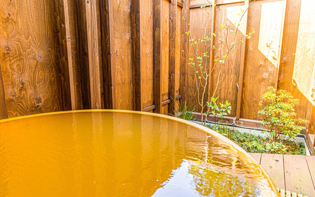 全国的に珍しい金温泉は鉄分を多く含んでいて、空気に触れることで酸化して無色透明から赤茶色になります。