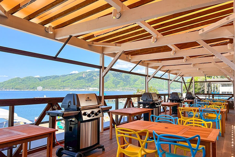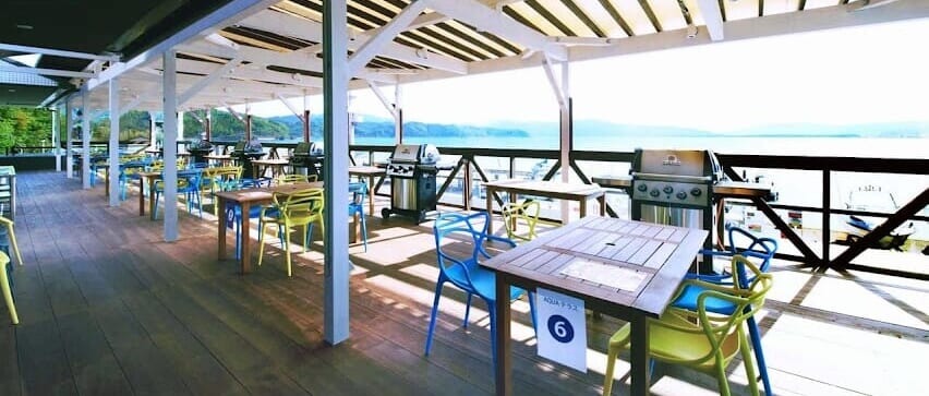 管理棟2階のテラスには、ハーバーに浮かぶ船と穏やかな宮津湾を臨むBBQ専門レストランがあります。
