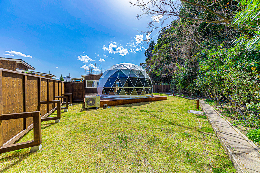 直径7mの大型ドーム型テント。テント内にはシングルベッドを2台配置しており、マットレスを使用すれば最大5名まで宿泊可能です。ペットも同伴可となっており、専用のドッグラン、専用の食事スペース、天然温泉も完備しておりますので、ゆったりとプライベート空間をご堪能下さい。